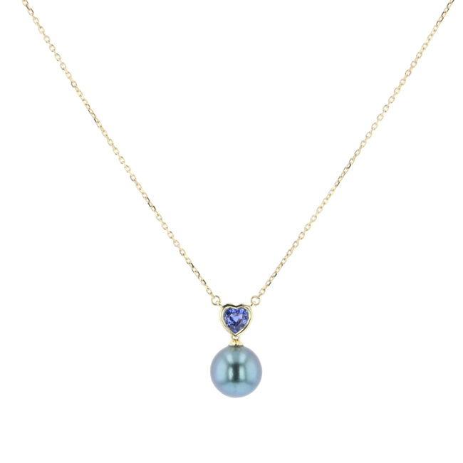 Hinerava’s Poésie Collection presents this romantic necklace that unites the brilliance of a blue sapphire, 0.39ct, with the timeless elegance of a Tahitian pearl. The heart, set in 14K yellow gold, radiates warmth and femininity, while the 8 mm steel-blue pearl adds a touch of ocean‑born sophistication.