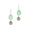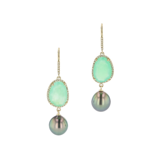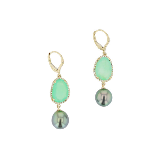 Hinerava’s Poésie Collection presents an exceptionnal verdant pair of earrings made of two exquisite chrysoprases, 4.16 carats, two chrome diopsides, 1.39 carats, haloed by diamonds, 0.3 carats and finished with 8-9mm emerald Tahitian pearls. Set in 14K yellow gold, this composition is the perfect blend of technical sophistication and aesthetic refinement. Length: 5.5 cm.