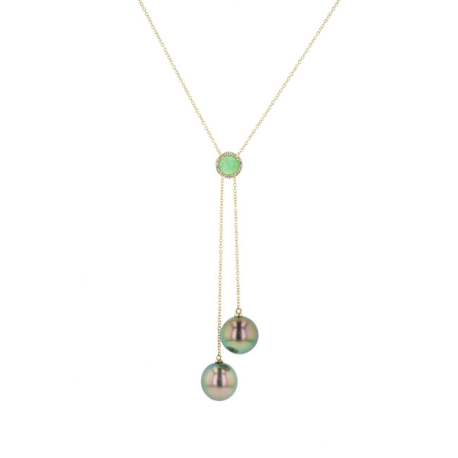 Hinerava’s Signature Collection presents an exquisite chrysoprase & diamond adjustable pearl necklace, featuring a sliding center piece with a 1.27 carats chrysoprase gem adorned with white diamonds, 0.05 carats, which allows for length versatility. Two exquisite Tahitian pearls are expertly selected to contrast in color, thus epitomizing its name “Toi & Moi” (You & I). This simply sophisticated necklace set in 14K yellow gold, is minimalistic and always elegant. Lenght: 60 cm.