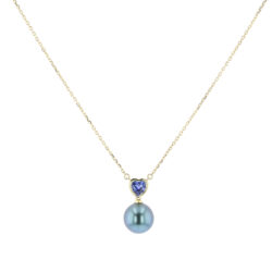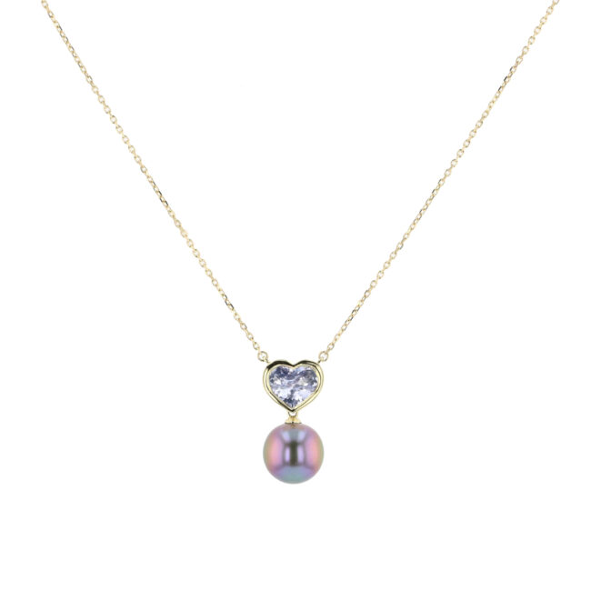 Hinerava’s Poésie Collection presents this romantic necklace that unites the brilliance of a lavender sapphire, 1.24ct, with the timeless elegance of a Tahitian pearl. The heart, set in 14K yellow gold, radiates warmth and femininity, while the 8 mm rainbow pearl adds a touch of ocean‑born sophistication.