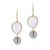 Hinerava’s Poésie Collection features a celestial pair of earrings made with rainbow moonstones, 6.66 carats, adorned with brillant diamonds, 0.24 carats, and matched with 9mm Tahitian pearls, set in 14K yellow gold. A quintessential Hinerava design that is romantic and ever so elegant. Length: 4 cm.