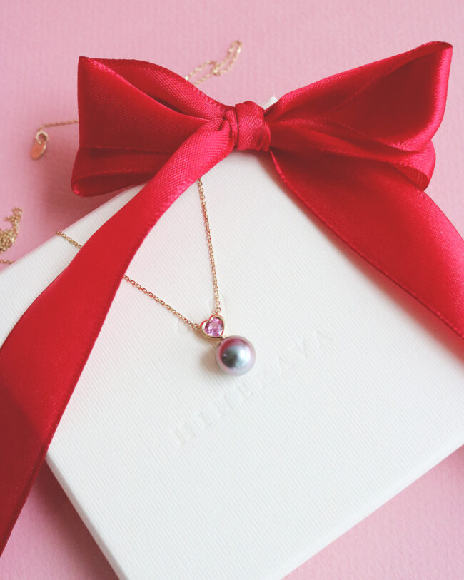 Hinerava’s Poésie Collection presents this romantic necklace that unites the brilliance of a pink sapphire, 0.79ct, with the timeless elegance of a Tahitian pearl. The heart, set in 14K yellow gold, radiates warmth and femininity, while the 8 mm rose pearl adds a touch of ocean‑born sophistication.