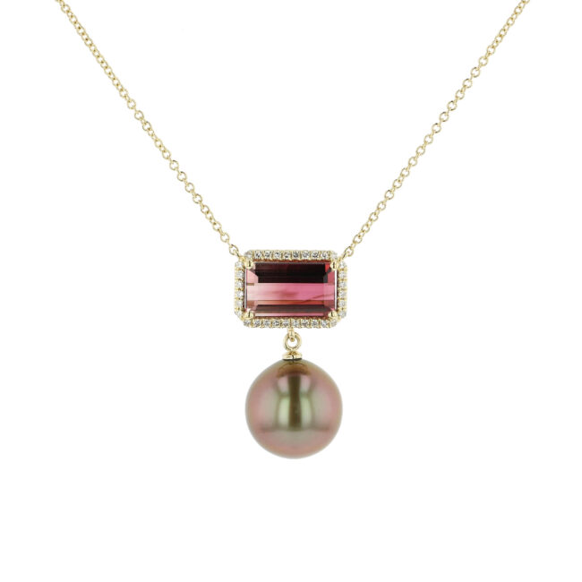Hinerava’s Poésie Collection presents an exceptionnal red emerald cut tourmaline of 2.81 carats, haloed by diamonds 0.11 carat, and matched to an exquisite 10mm Tahitian pearl. The necklace is set in 14K yellow gold. Length: 40 cm with a 5 cm extension chain.