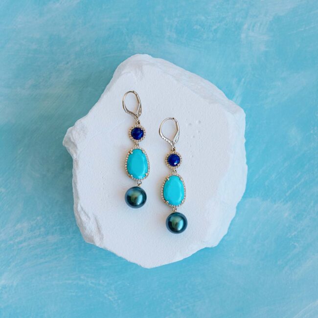 Hinerava’s Poésie Collection presents an exquisite pair of duster earrings made with alternating turquoise and lapis lazuli gems, symbolically representing the hues of our Polynesian ocean and lagoons. The design is finished with two exceptionnal and perfectly matched 8 to 9mm Tahitian pearls. Set in 14K yellow gold with 1.2 ct Turquoise and1.04ct lapis lazuli gems. This quintessential Hinerava design is a discreet expression of romanticism and pure elegance. Length: 7.5 cm.