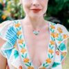 Hinerava’s Poésie Collection presents an exceptional open ring made with a unique turquoise gem, 2.51 carats, haloed with brillant diamonds, 0.1 carats, and a lustruous 9 to 10mm Tahitian pearl carefully chosen to complement the turquoise. This in-between-the-finger style ring is set in 14K yellow gold. A quintessential Hinerava design that is romantic and ever so elegant.