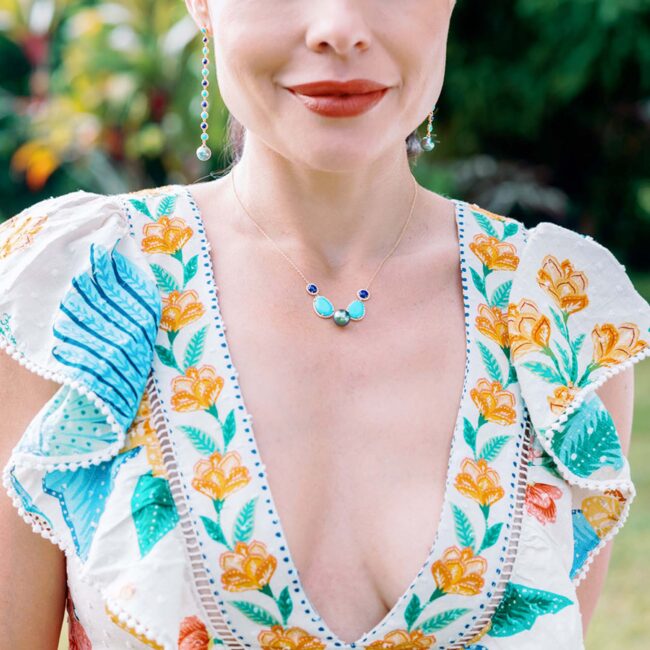 Hinerava’s Poésie Collection presents an exceptional azureous gem composition: a 9mm blue lagoon Tahitian pearl centers two turquoise gems, 5.18 carats, and two lapis lazuli gems, 0.84 carats, each haloed by diamonds, 0.3 carats. Set in 14K yellow gold, this composition is the perfect blend of technical sophistication and aesthetic refinement. Length: 40 cm with a 5 cm extension chain.