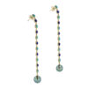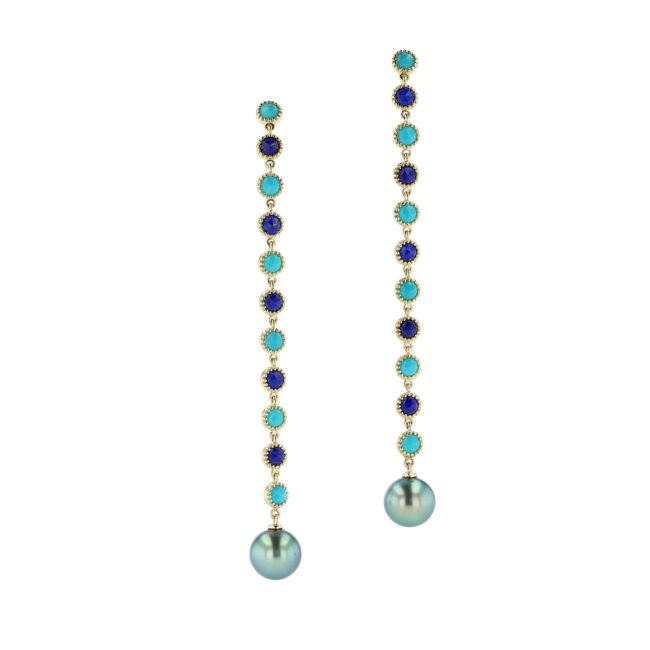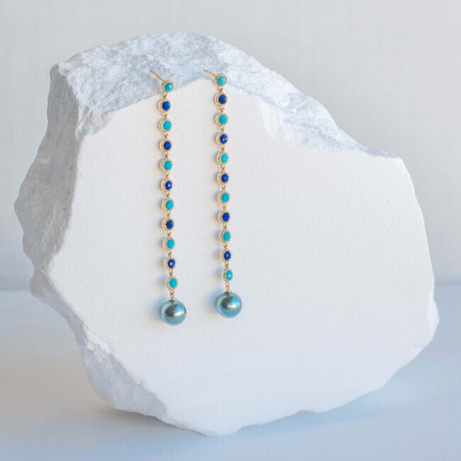 Hinerava’s Poésie Collection presents an exquisite pair of duster earrings made with alternating turquoise and lapis lazuli gems, symbolically representing the hues of our Polynesian ocean and lagoons. The design is finished with two exceptionnal and perfectly matched 8 to 9mm Tahitian pearls. Set in 14K yellow gold with 1.2 ct Turquoise and1.04ct lapis lazuli gems. This quintessential Hinerava design is a discreet expression of romanticism and pure elegance. Length: 7.5 cm.