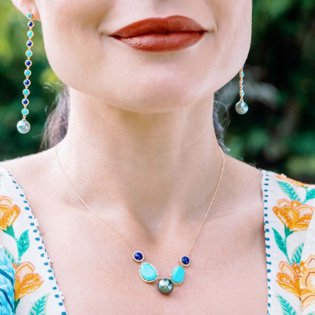Hinerava’s Poésie Collection presents an exceptional azureous gem composition: a 9mm blue lagoon Tahitian pearl centers two turquoise gems, 5.18 carats, and two lapis lazuli gems, 0.84 carats, each haloed by diamonds, 0.3 carats. Set in 14K yellow gold, this composition is the perfect blend of technical sophistication and aesthetic refinement. Length: 40 cm with a 5 cm extension chain.