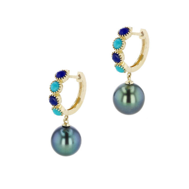 Hinerava’s Poésie Collection presents an exquisite pair of huggie earrings made with alternating turquoise gems, 0.45 ct and lapis lazuli gems, 0.45 ct, mounted in 14K yellow gold, symbolically representing the hues of our Polynesian ocean and lagoons. The design is finished with two exceptionnal and perfectly matched 8mm Tahitian pearls. This quintessential Hinerava design is a discreet expression of romanticism and pure elegance. Length: 2.5 cm.