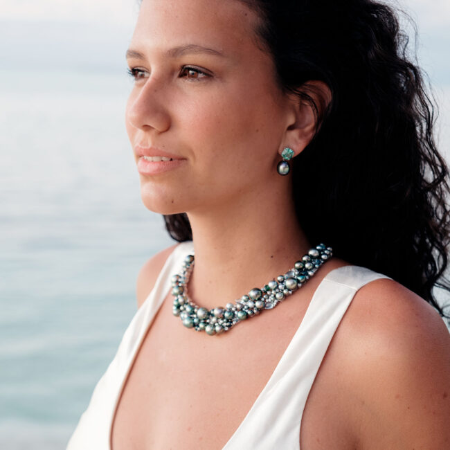 Hinerava’s Privilège Collection presents this gemological masterpiece that features 136 exceptional Tahitian pearls and keshis, expertly matched to blues of aquamarine and tourmaline, all linked by brillant white sapphires, 10.2 carats, set in 68.6 grams of 18K white gold.