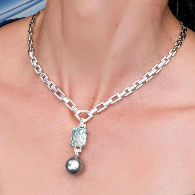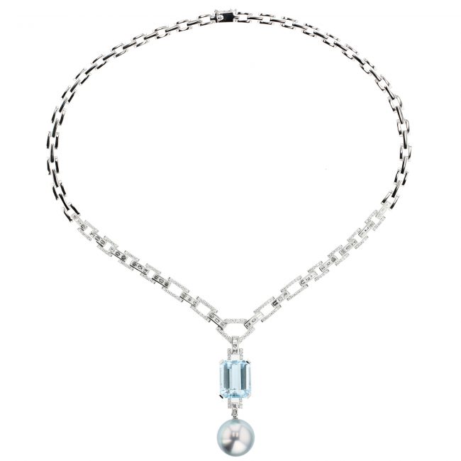 A display of innovative design and masterful craftsmanship, Hinerava’s Privilège Collection combines scintillating diamonds, a flawless aquamarine centerstone and an iridescent Tahitian pearl in this alluring masterpiece. Brillant diamonds weighing a total of 5.77 carats are set in 31.02 grams of 18K white gold linked to a stupendous 15.30 carat emerald cut aquamarine and an exceptional 16.08mm light blue Tahitian pearl.