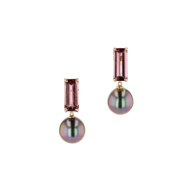 This exceptional pair of earrings features an esthetically refined design with two gem quality, rosy-lavender, 9mm Tahitian pearls matched to pink, elongated emerald cut tourmalines, 3.10ct, mounted on 1.97g of 18K rose gold. A one-of-a-kind creation from Hinerava’s Privilège Collection of dramatically vibrant and luxurious jewels. Length: 2.5cm