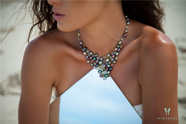 Hinerava’s Privilège Collection features the one of a kind Rainbow Necklace, composed of exceptional multicolored Tahitian pearls and semi-precious cabochons, including aquamarine, chalcedony, citrine, and rose quartz, set in 18K yellow gold. Length : 42 cm