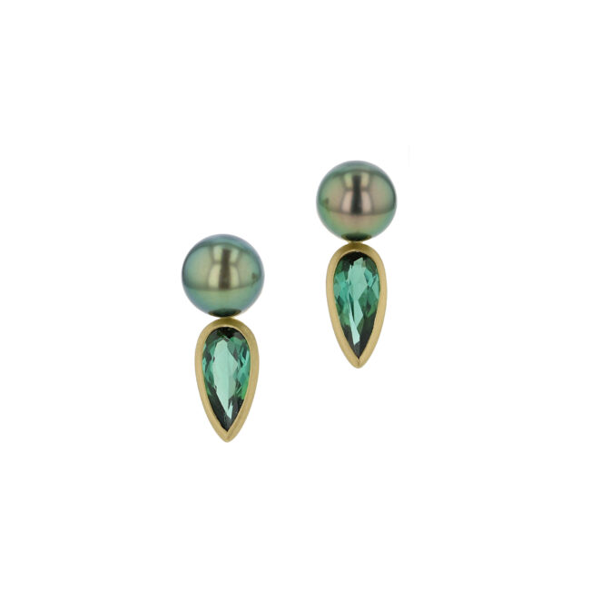 This striking pair of earrings features two pear cut green tourmaline gemstones weighing 10.57 carats, perfectly matched to two green 9mm Tahitian pearls, mounted in 18K yellow gold bezel with satin finish. These versatile earrings are designed to be worn with or without the tourmalines, resulting in two styles of earrings in one. The deep verdant hues of this pair of earrings are a symbol of vitality and a tribute to the luxurious flora of French Polynesian islands.