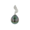 Hinerava’s Signature Collection presents an exceptional diamond & pearl pendant, composed of leaf design paved with brillant diamonds, 0.08 carats and highlighted with a 10mm gem quality, green Tahitian pearl, set in 0.68 grams of 18K white gold. Wear it on your favorite chain. Length: 2.5cm.