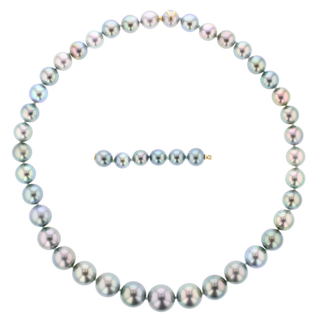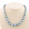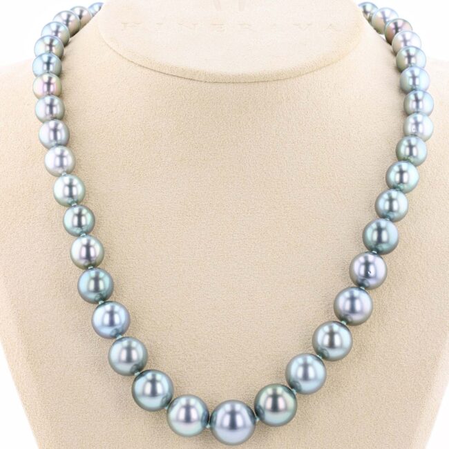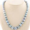 The Hinerava Blue Mirage Pearl Necklace is an exquisite masterpiece, artfully composed of 45 lustrous round Tahitian pearls, each graded within the esteemed AB category. This exceptional creation showcases a rare symphony of blue shimmering hues, elegantly graduated in size from a captivating 9mm to a commanding 14mm, embodying both rarity and grandeur.