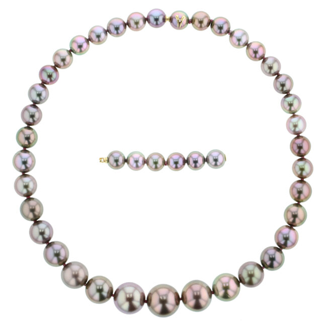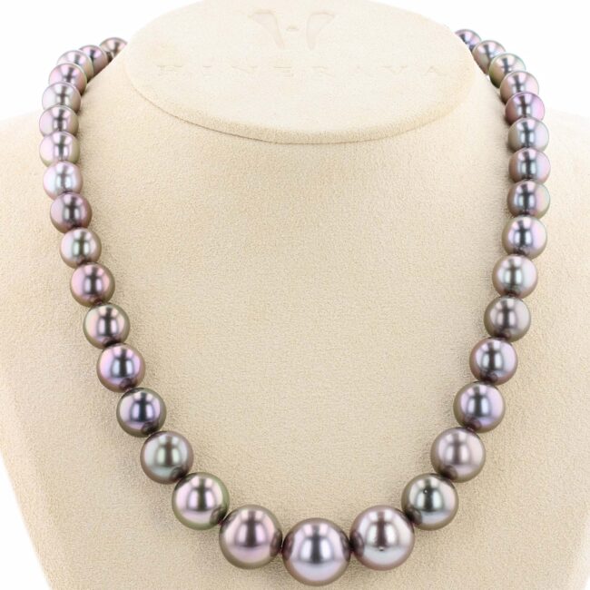 The Hinerava Cocoa Blush Pearl Necklace is an exquisite masterpiece, artfully composed of 43 lustrous round Tahitian pearls, each graded within the esteemed AB category. This exceptional creation showcases a rare symphony of chocolate depth with rosy undertones, elegantly graduated in size from a captivating 9mm to a commanding 16mm, embodying both rarity and grandeur.