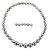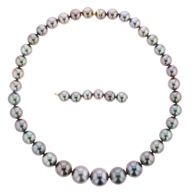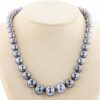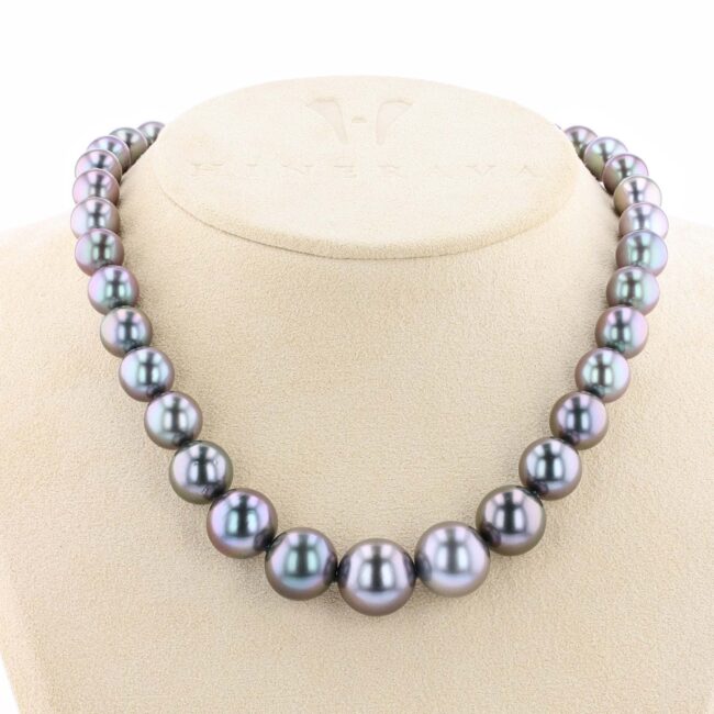 The Hinerava Lavender Mist Pearl Necklace is an exquisite masterpiece, artfully composed of 43 lustrous round Tahitian pearls, each graded within the esteemed AB category. This exceptional creation showcases a rare symphony of lilac and silver shades, elegantly graduated in size from a captivating 9mm to a commanding 14mm, embodying both rarity and grandeur.