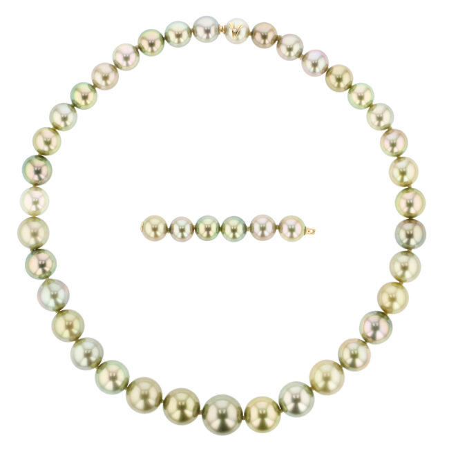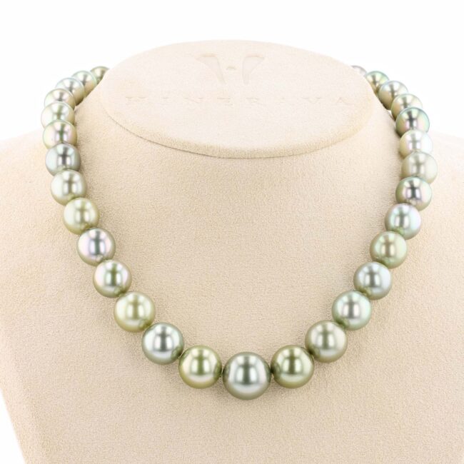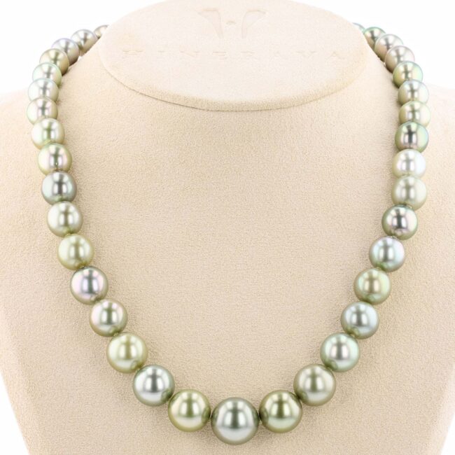 The Hinerava Chartreuse Glow Pearl Necklace is an exquisite masterpiece, artfully composed of 43 lustrous round/semi-round Tahitian pearls, each graded within the esteemed AB category. This exceptional creation showcases a rare symphony of soft green and golden hues, elegantly graduated in size from a captivating 9mm to a commanding 14mm, embodying both rarity and grandeur.