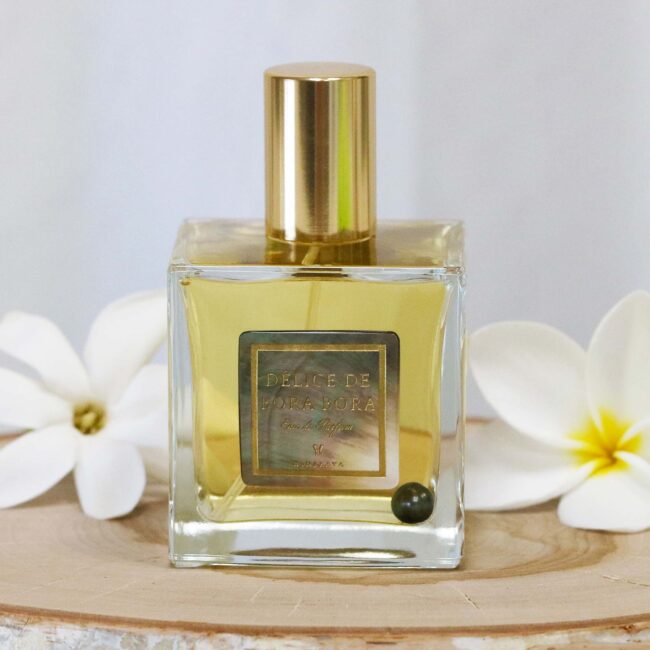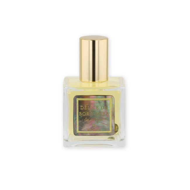 Hinerava’s Eau de Parfum Délice de Bora Bora is elegantly housed in a distinctive 50ml perfume bottle featuring the Hinerava signature mother of pearl label and a Tahitian pearl nestled inside.