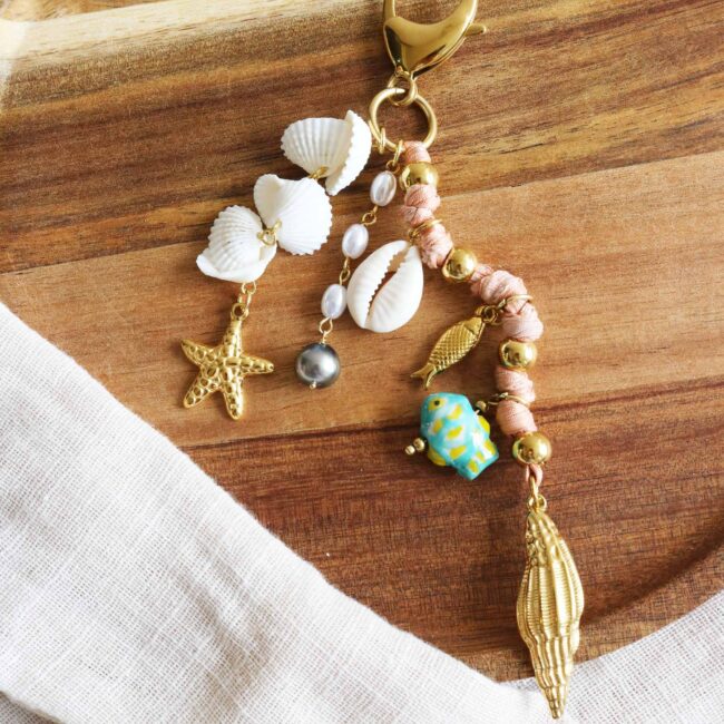 Elevate your everyday with a bag charm that carries the soul of the sea. Inspired by coastal serenity and island elegance, this piece features hand-selected marine elements brought together in perfect harmony. At its heart glows a Tahitian pearl, prized for its deep, iridescent hues and natural mystique.