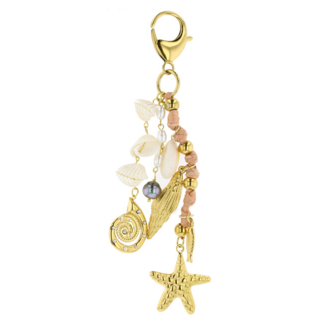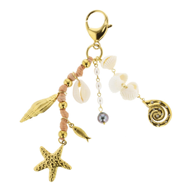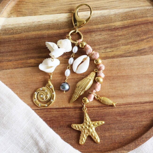 Elevate your everyday with a bag charm that carries the soul of the sea. Inspired by coastal serenity and island elegance, this piece features hand-selected marine elements brought together in perfect harmony. At its heart glows a Tahitian pearl, prized for its deep, iridescent hues and natural mystique.