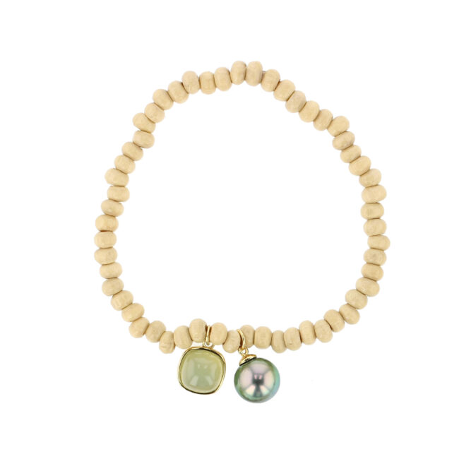 Hinerava’s Elements Collection presents an understated wood bead bracelet with a prehnite and a pearl charm, mounted on a stretch elastic for ease and comfort. This elastic wood bead bracelet makes the perfect everyday bracelet and looks great as part of a stack.