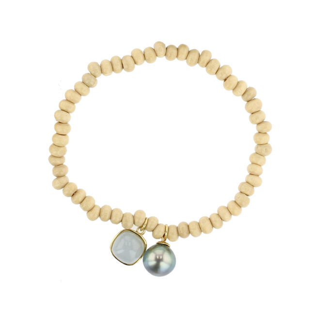 Hinerava’s Elements Collection presents an understated wood bead bracelet with an aqua blue chalcedony and a pearl charm, mounted on a stretch elastic for ease and comfort. This elastic wood bead bracelet makes the perfect everyday bracelet and looks great as part of a stack.