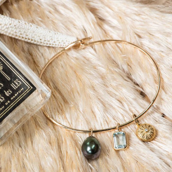 Hinerava presents this delicate 14K yellow gold bangle that is customizable with our selection of lovely charms. By wearing it, you shall carry a token of Bora Bora wherever you go.