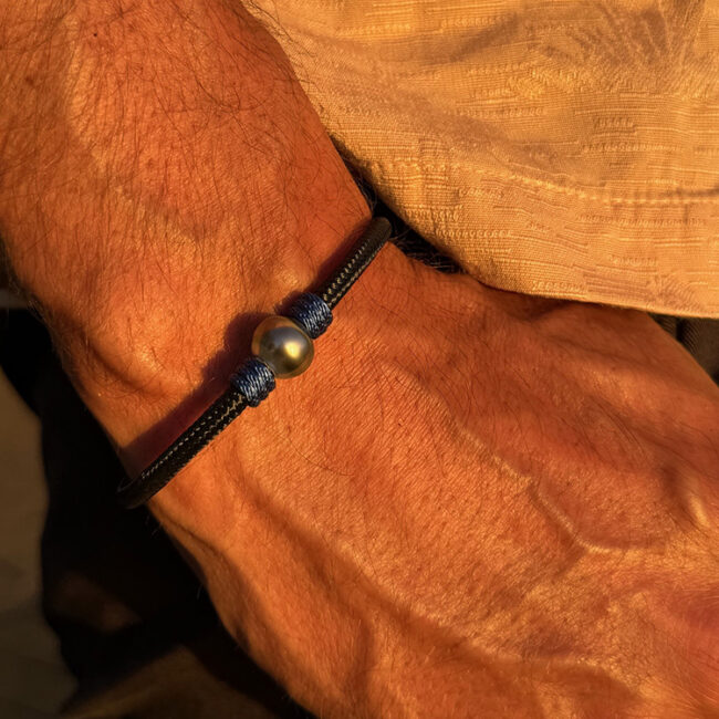 His Hinerava Collection features a solid black & blue cord pearl bracelet made with high strength nautical cable that offers a comfortable fit. A 10mm Tahitian pearl is mounted between blue cord knots and the bracelet closes securely with a solid clasp that is abrasion resistant. Length: 20cm/21cm