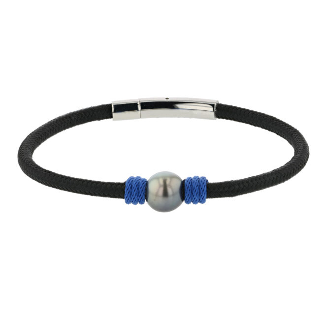 His Hinerava Collection features a solid black cord pearl bracelet made with high strength nautical cable that offers a comfortable fit. A 10mm Tahitian pearl is mounted in 18K yellow gold sleeve and the bracelet closes securely with a solid clasp that is abrasion resistant. Length: 20cm