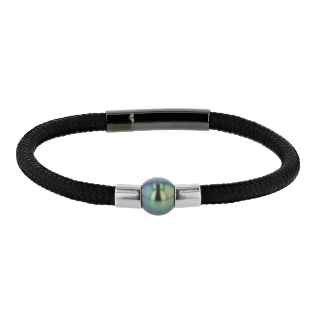 His Hinerava Collection features a solid black cord pearl bracelet made with high strength nautical cable that offers a comfortable fit. A 10mm Tahitian pearl is mounted in 18K white gold sleeve and the bracelet closes securely with a solid clasp that is abrasion resistant. Length: 20cm