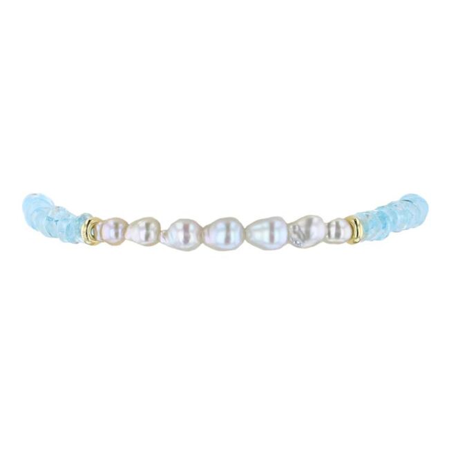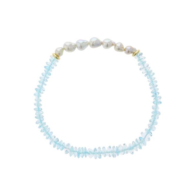 Hinerava’s Nacara Collection features a blue topaz bracelet with 5 natural keshi, mounted on a stretch elastic for ease and comfort. This minimalistic stretch bracelet makes the perfect everyday accesory and looks great as part of a stack.