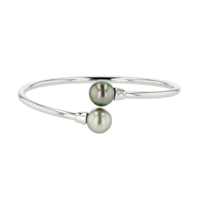 Hinerava’s Elements Collection features a contemporary flexible bracelet with two expertly selected pearls to contrast in color and size, set in sterling silver. The Toi & Moi design is a trendy symbol of love.