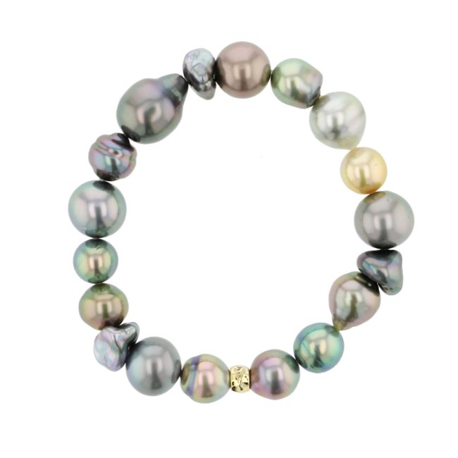 Our Signature Collection features this vibrant harvest pearl bracelet composed of a striking display of the various specimens of Tahitian pearls, including round, circled, baroque, and every shape in between, mounted on a stretch elastic for ease and comfort.