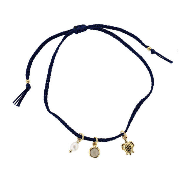 Hinerava’s Tetiaroa Collection introduces an adjustable bracelet made with trendy charms: a chalcedony, a beautiful keshi and a vermeil or sterling silver turtle, mounted on a navy blue cord. The purchase of this bracelet contributes to our Giving Back program, where Hinerava dedicates funds to Tetiaroa Society in the preservation of the marine environment. With every bracelet purchased, a turtle is saved.