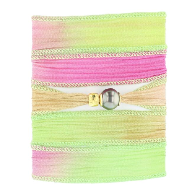 Hinerava’s Elements Collection features an original and timeless design with a unique Tahitian pearl strung on a hand-dyed silk. Each silk is hand dipped and slight variations are the result of beautifully crafted pieces. Our team expertly matches the colors of Tahitian pearls with the silk upon which they are strung, however if you have a color preference please let us know. Silk Pearl Bracelet measures 35″
