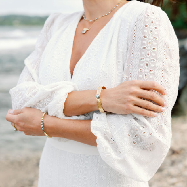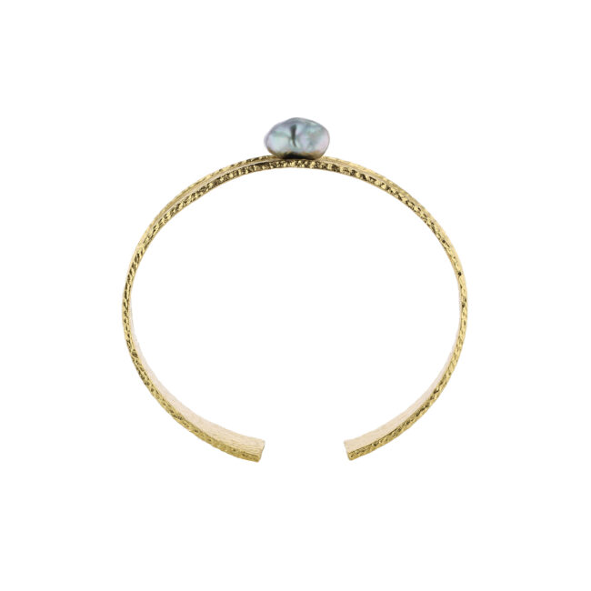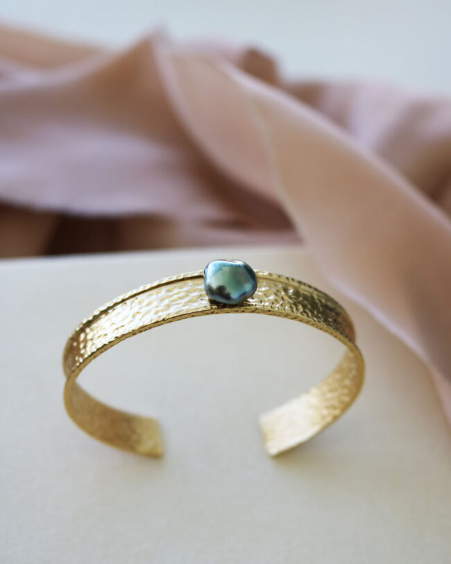 Hinerava’s Nacara Collection presents this trendy organic hammered bangle, set in vermeil, with a lustruous baroque keshi pearl. A modern Hinerava design to complete your favorite bohemian style.