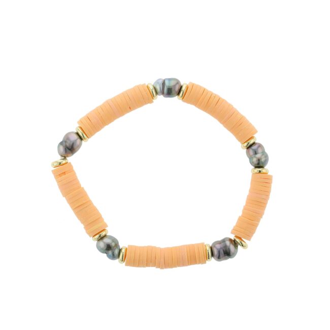 Hinerava's Nacara Collection features a peach clay stretch bracelet with 5 natural keshi in a row, mounted on a stretch elastic for ease and comfort. This fun bracelet makes the perfect everyday accessory and looks great as part of a stack.