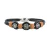 His Hinerava Collection features a trendy masculine piece composed of robust black and brown leather and three colorful circled Tahitian pearls of 12 to 13 mm.