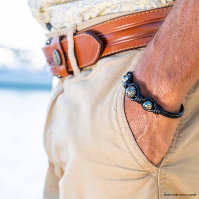 His Hinerava Collection features a trendy masculine piece composed of robust black leather and three colorful circled Tahitian pearls of 12 to 13 mm.