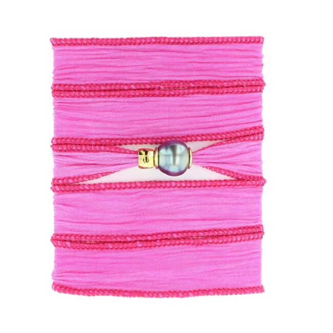Hinerava’s Elements Collection features an original and timeless design with a unique Tahitian pearl strung on a hand-dyed silk. Each silk is hand dipped and slight variations are the result of beautifully crafted pieces. Our team expertly matches the colors of Tahitian pearls with the silk upon which they are strung, however if you have a color preference please let us know. Silk Pearl Bracelet measures 35″