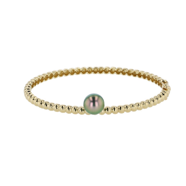 Hinerava’s Signature Collection features a delicate twist bangle with a single 8mm Tahitian pearl, set in 14K yellow gold. This elegant bracelet is perfect for mixing, matching, and layering.