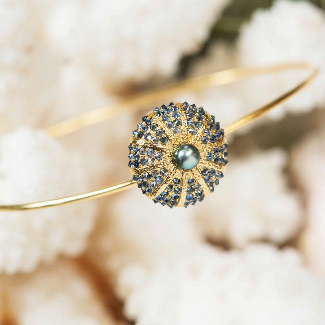 Hinerava presents this outstanding urchin bangle paved with white sapphires weighing 1.27 carats, with a lovely keshi in its center, and set in 14K white gold. The stones are set in a unique fashion as to mimic the spiny nature of an urchin and its design is an ode to the ubiquitous “vana” found in French Polynesia. Length: 16cm.