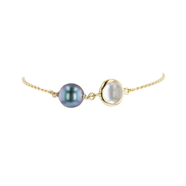 Hinerava’s Elements Collection presents this elegant bracelet that is crafted in vermeil and has a white topaz cabochon adjacent to a splendid 9mm Tahitian pearl. A flowing Hinerava creation that is minimalist and stackable with your favorite bracelets. Length: 23cm.
