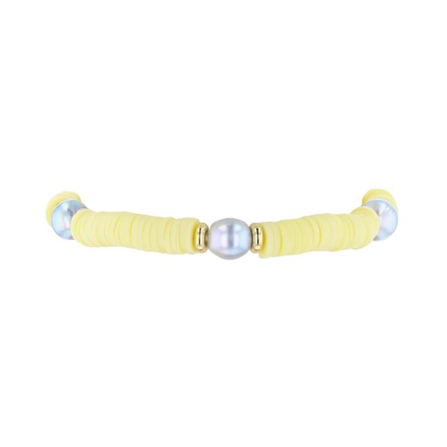 Hinerava's Nacara Collection features a yellow clay stretch bracelet with 5 natural keshi in a row, mounted on a stretch elastic for ease and comfort. This fun bracelet makes the perfect everyday accessory and looks great as part of a stack.