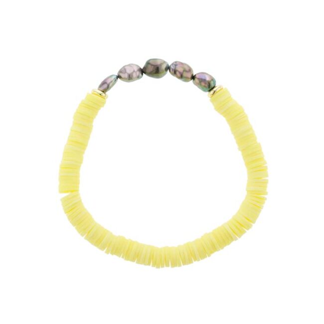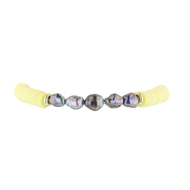 Hinerava's Nacara Collection features a yellow clay stretch bracelet with 5 natural keshi spaced out, mounted on a stretch elastic for ease and comfort. This fun bracelet makes the perfect everyday accesory and looks great as part of a stack.