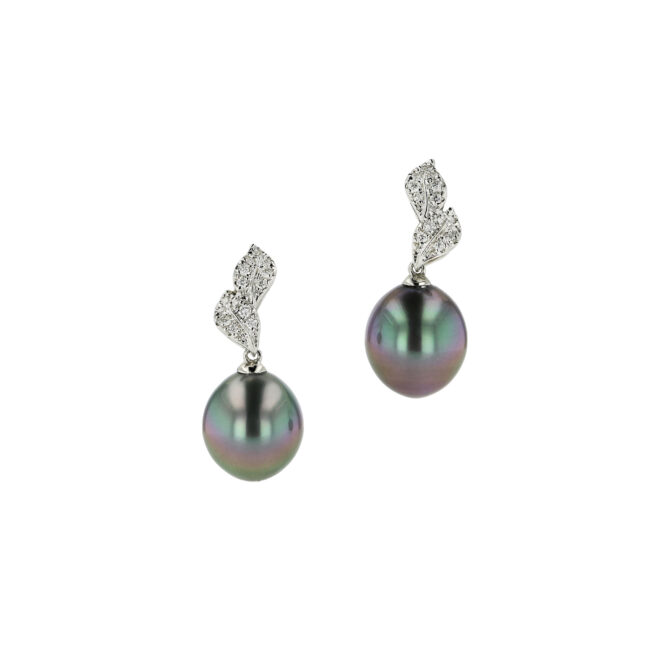 Hinerava’s Signature Collection presents exceptional diamond & pearl earrings, composed of leaf designs paved with brillant diamonds, 0.42 carats and highlighted with 11 mm green Tahitian pearls, set in 4.55 grams of 18K white gold.