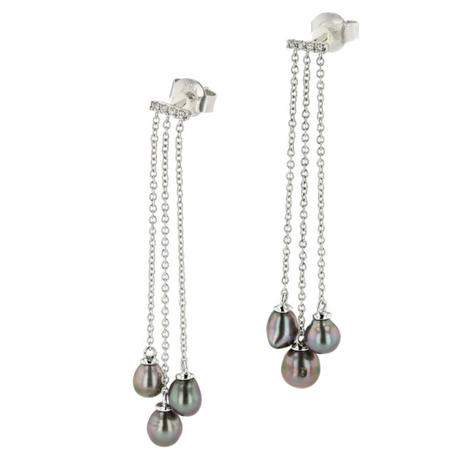 Hinerava’s Nacara Collection presents this elegant pair of earrings composed of a diamond post, 0.08 carats, with 3 Tahitian keshis layers on delicate chains, set in 14K white gold. This quintessential Hinerava design is a discreet expression of romanticism and pure elegance. Length: 4.5cm.