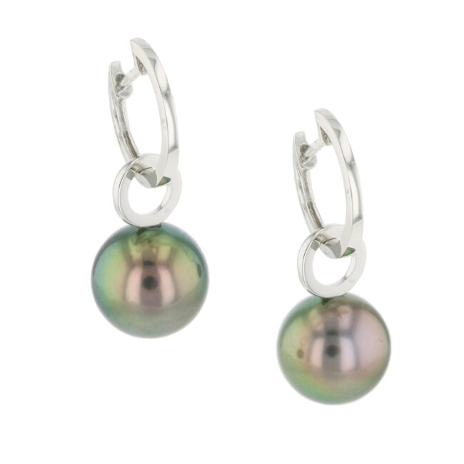 Hinerava’s Signature Collection features high polish huggie earrings, set in 14K white gold. Impeccably matched 10mm Tahitian pearls, AB quality, dangle from hoops. These versatile earrings allow the huggie to be worn with or without the pearl, resulting in two styles of earrings in one. Length: 3 cm.